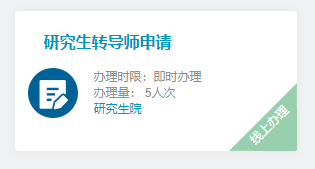 为深入贯彻“我为群众办实事”实践活动精神,落实学校“三保一争”要求,更加便利我校研究生办理学籍异动相关事务,学校内网综合服务门户——网上办事大厅发布了《研究生转导师申请》(线上版),旨在结合学校学籍异动管理工作运行实际,以更高效率服务研究生转导师工作。现将研究生线上申请转导师流程介绍如下: