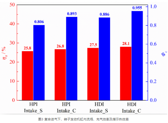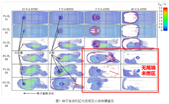 (1)通过采用压缩腔氢气缸内直喷,使氢气不再挤占进缸空气量,有效提高转子发动机充量系数(由气道喷氢的0.806提高到压缩腔氢气缸内直喷后的0.886)并消除进气道回火;并通过压缩腔氢气缸内直喷控制适当浓度的氢气分布在火花塞及燃烧室尾端区域,利用较浓混合气的高火焰速度,消除转子发动机燃烧室尾端的燃烧死区;在提高转子发动机充气效率的同时,还有效改善了缸内燃烧过程,提高转子发动机的燃烧效率和热效率。