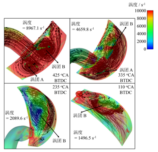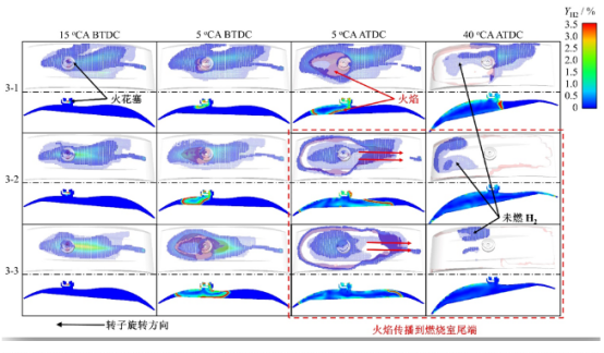 (2)针对压缩腔氢气缸内直喷产生局部混合气浓区导致已燃区内存在不完全燃烧产物的问题,提出了不同喷射位置及喷射策略下,利用氢气射流、主流流场与滚流涡团相互作用诱导形成均质且无过浓区域混合气的控制方法,在消除转子发动机燃烧室尾端燃烧死区的同时,还促进了缸内混合气的完全燃烧,进一步提高转子发动机燃烧效率与排放特性。