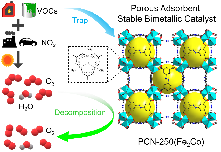 Catalytic ozone decomposition and adsorptive VOCs removal in bimetallic metal-organic frameworks. |